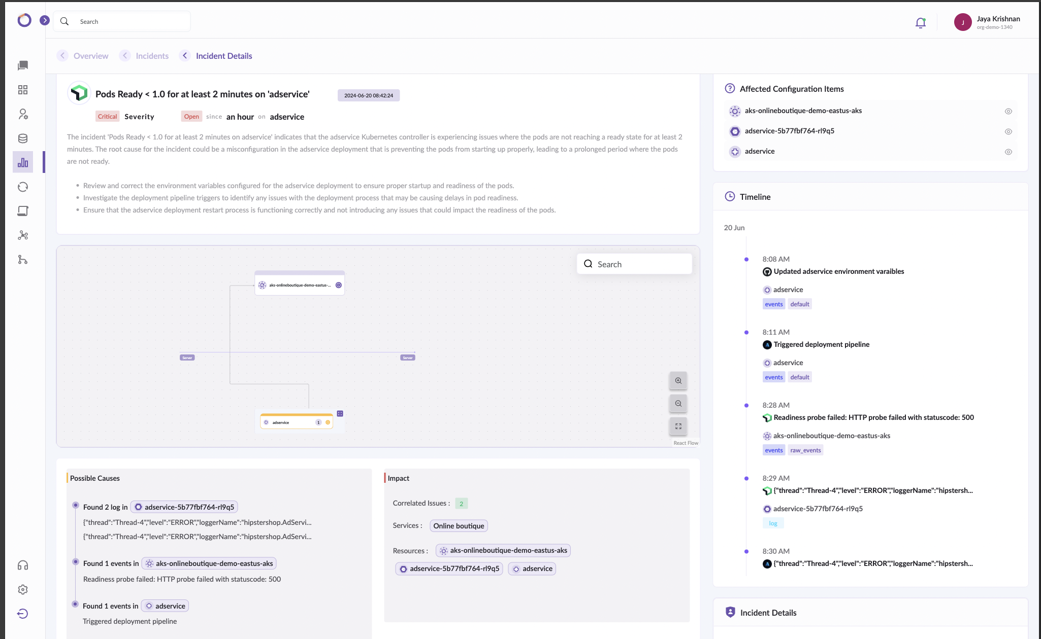 You will get a detailed description of your incident with possible causes and fixes along with a Service Map and a timeline that is filtered based on impact and should contain all the events from all connected systems. As an add-on, you will get suggested solutions filtered for your incident.
