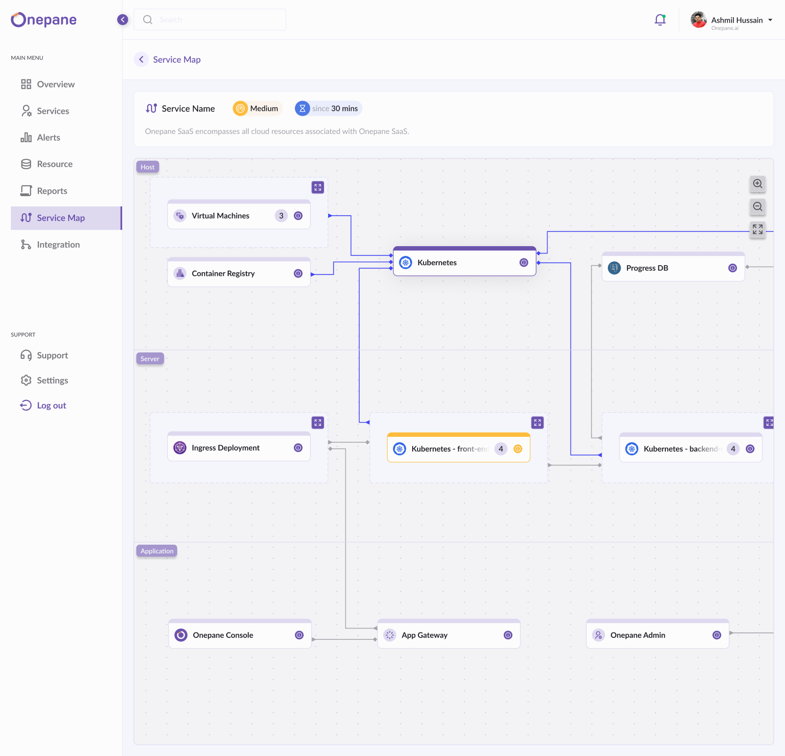 Onepane's multi-tier service maps are equipped with robust health monitoring and alerting functionalities. You can: