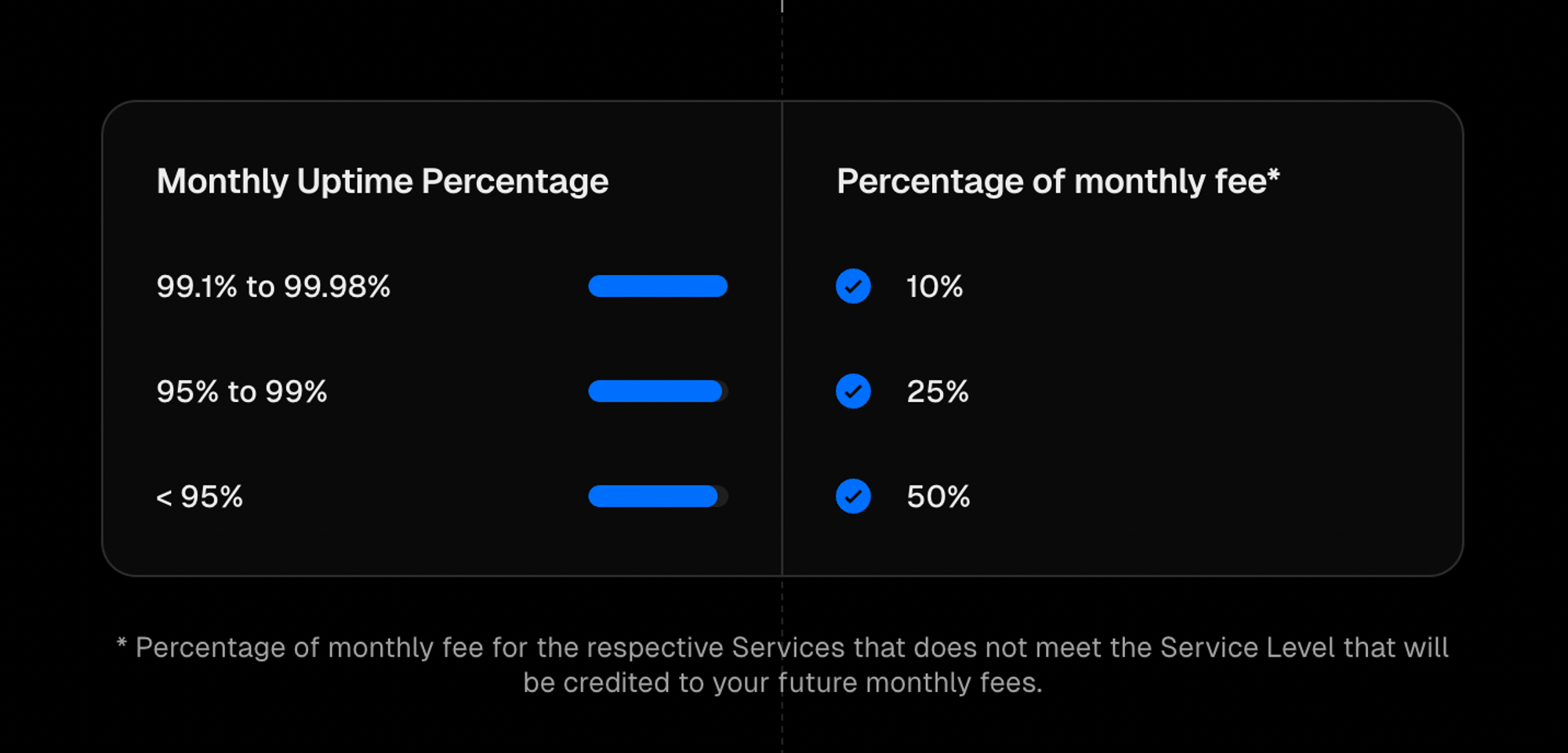 Take the example of Vercel's SLA, which guarantees 99.99% uptime. This translates to approximately 8.6 seconds of downtime per day or 52 minutes and 9.8 seconds per year. If Vercel fails to meet this SLA, they offer credits to customers.